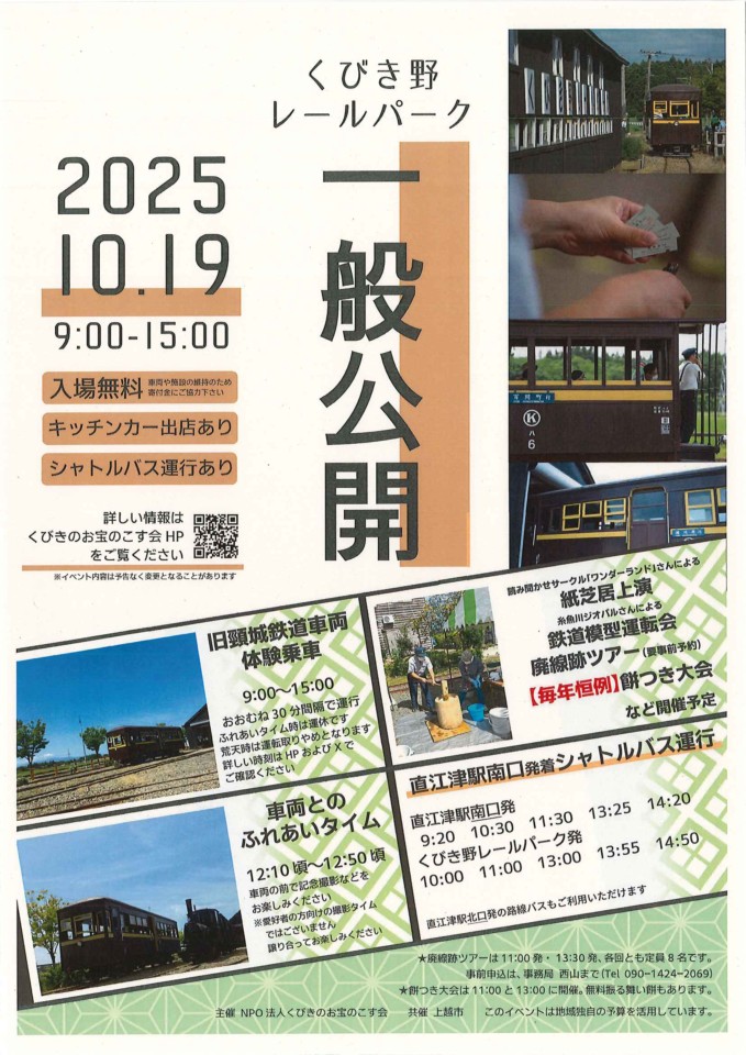 10月19日(日)9:00~15:00 くびき野レールパークで一般公開を行います。
