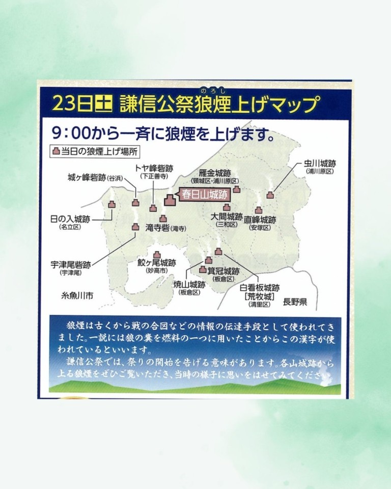 謙信公祭の開始を告げる合図の狼煙上げが、春日山城跡を中心に上越地域全14ヵ所で行われます!