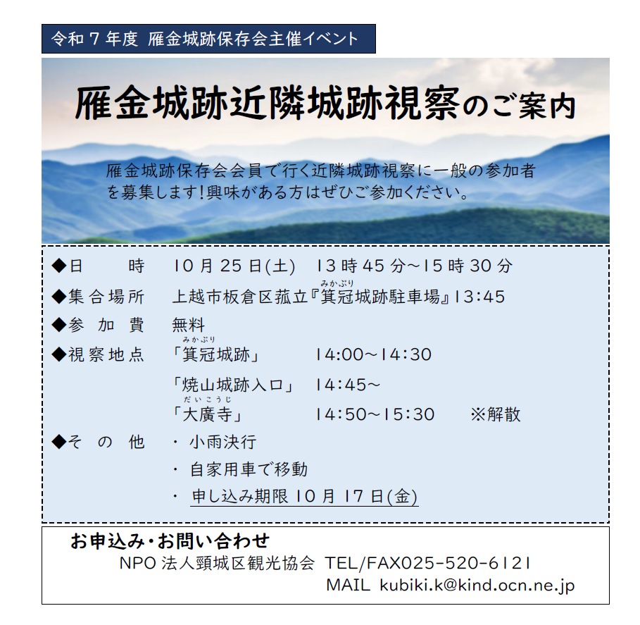 NPO法人頸城区観光協会 TEL/FAX 025-520-6121 MAIL kubiki.k@kind.ocn.ne.jp